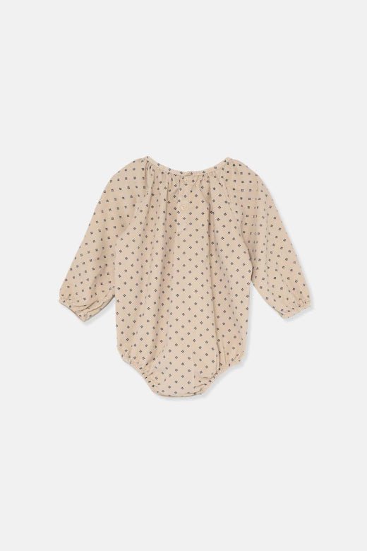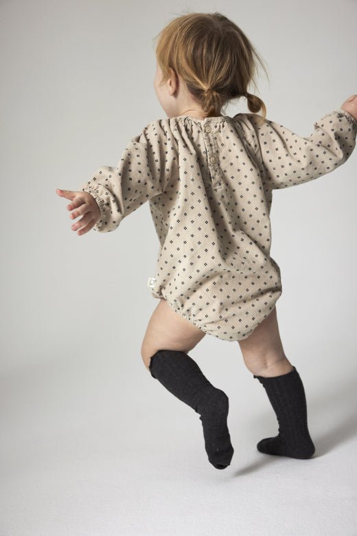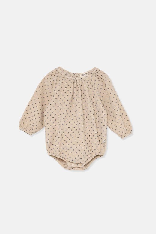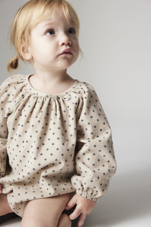Beige long sleeve corduroy romper for baby girls and toddlers, a timeless piece made for cozy fall and winter layering. With a delicate geometric print and a relaxed fit, it offers softness, breathability, and easy movement for everyday comfort.