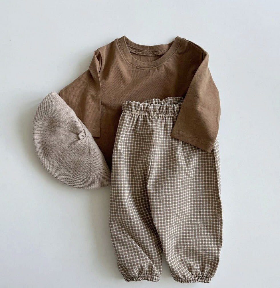 Brown plaid baby pants in linen like cotton for babies and toddlers, a comfortable everyday essential with an easy elastic waist and cuffs for all day wear and effortless style.