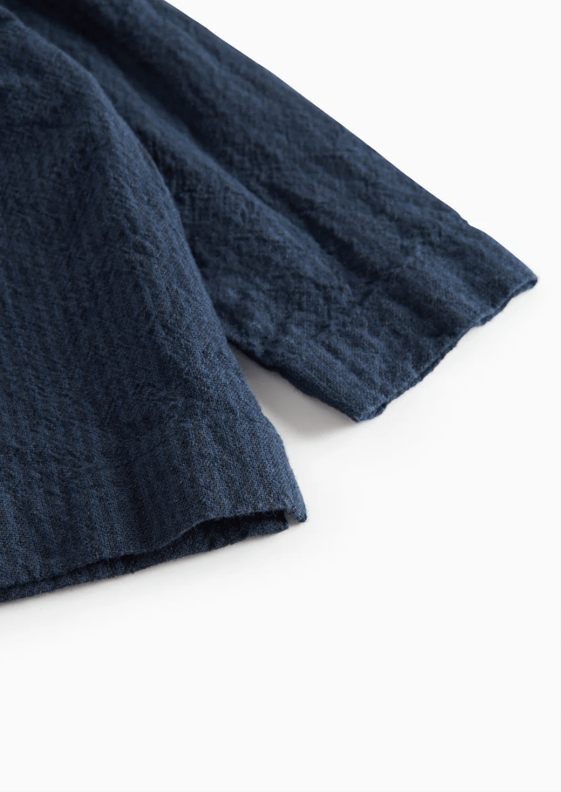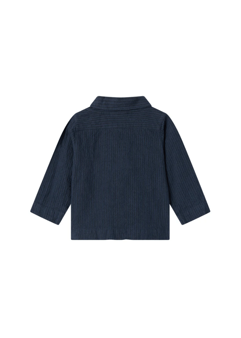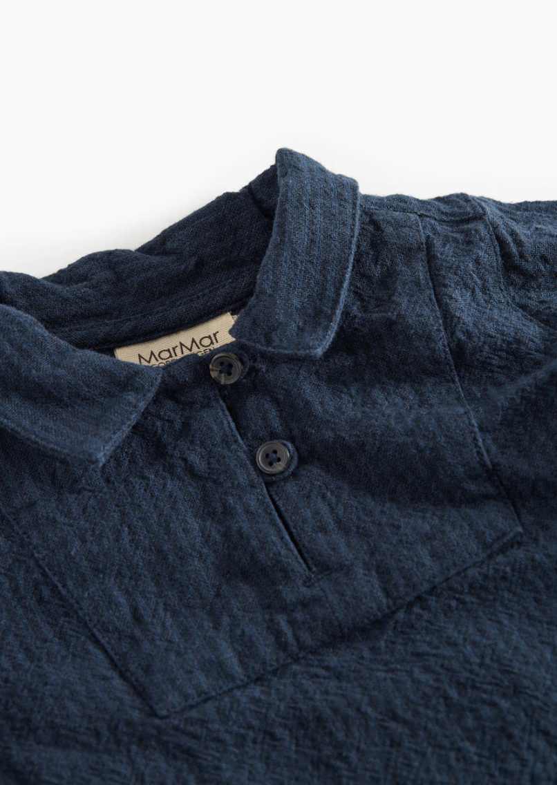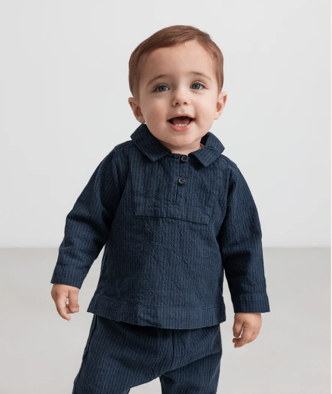 Dark blue chambray top for baby boys with a classic collar and half front closure, crafted from 100% cotton for softness and breathability. A timeless piece that brings relaxed polish to everyday wear, perfect for layering through all seasons.