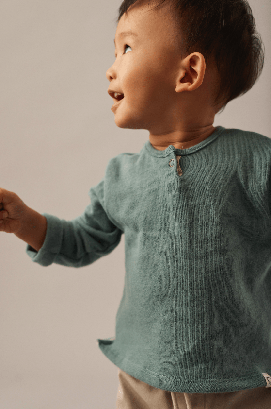 Toddler green long sleeve top in buttery soft cotton, perfect for cozy winter outfits and everyday play. Lightweight and breathable, it keeps little ones comfortable while pairing effortlessly with favorite layers.