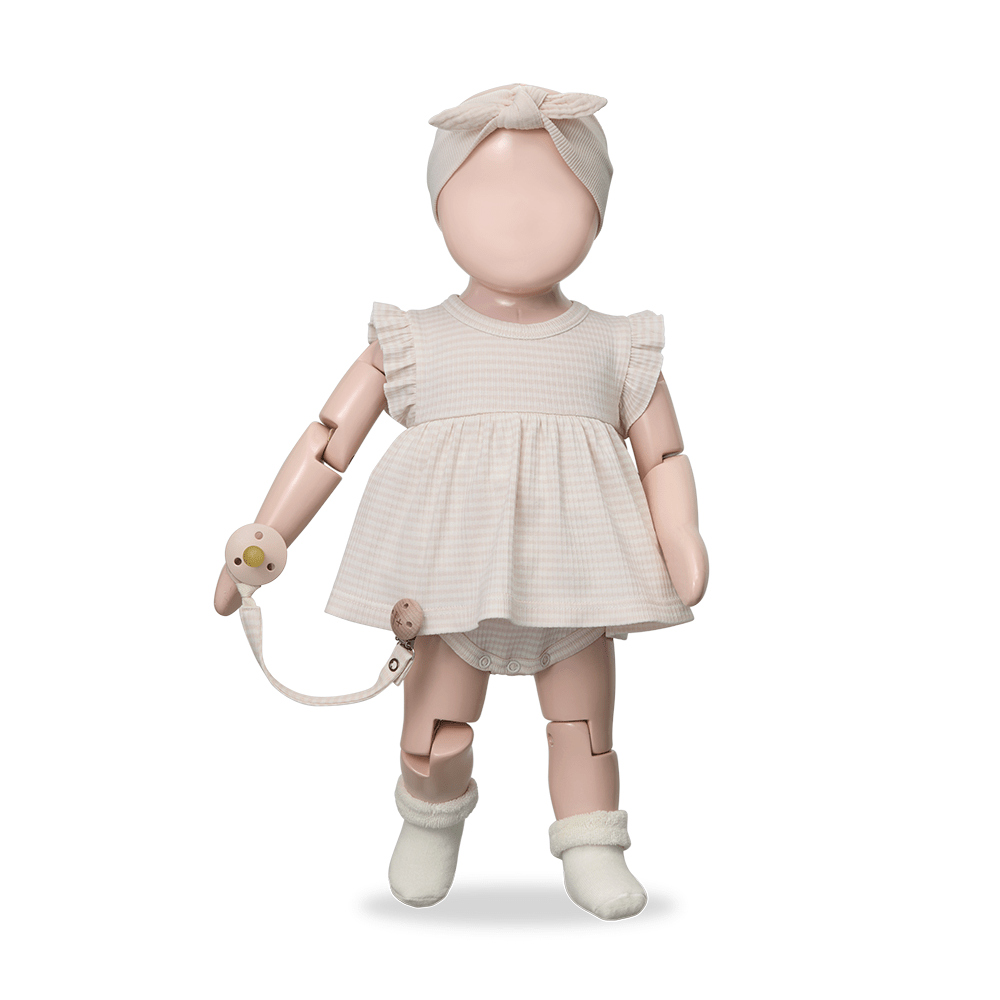Striped knit baby dress in nude for girls, a soft and timeless piece for spring days, playdates, and picture-perfect moments. Crafted from a delicately textured knit, this dress combines comfort, coverage, and effortless charm.