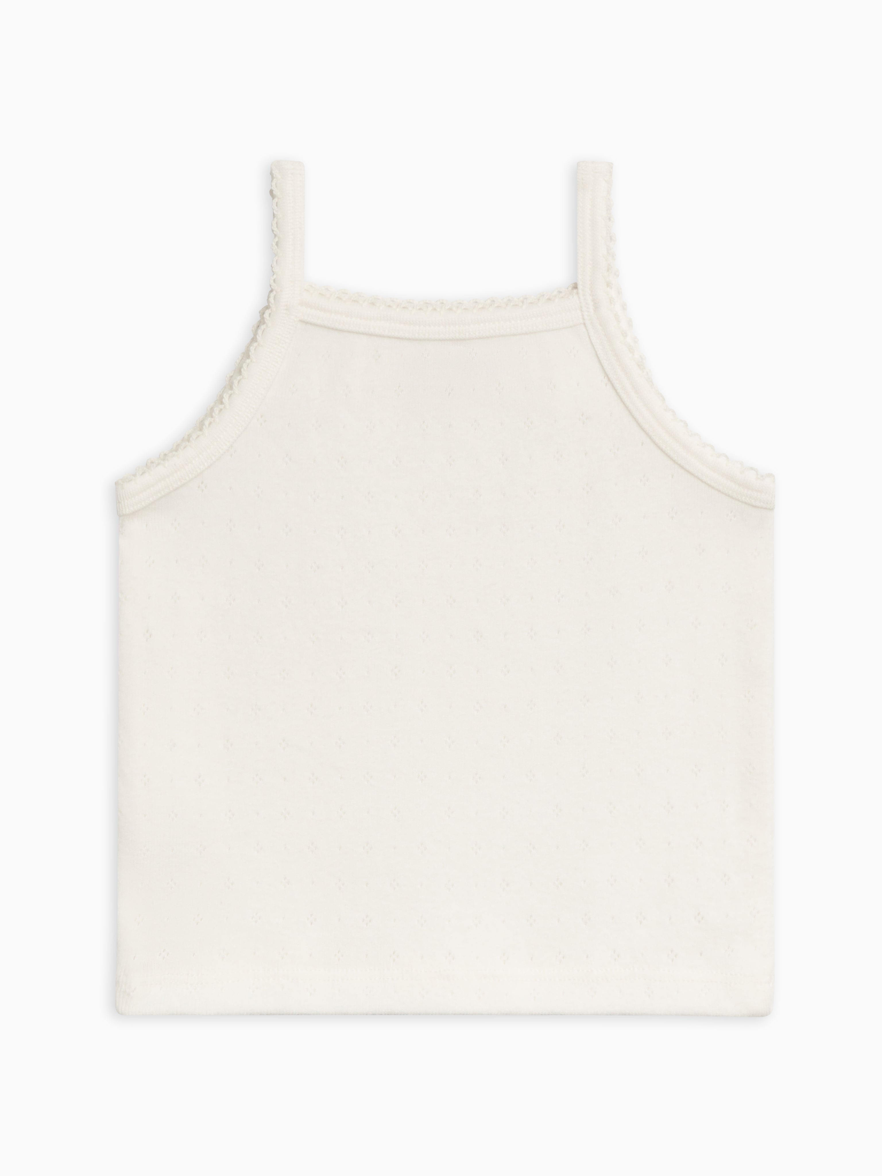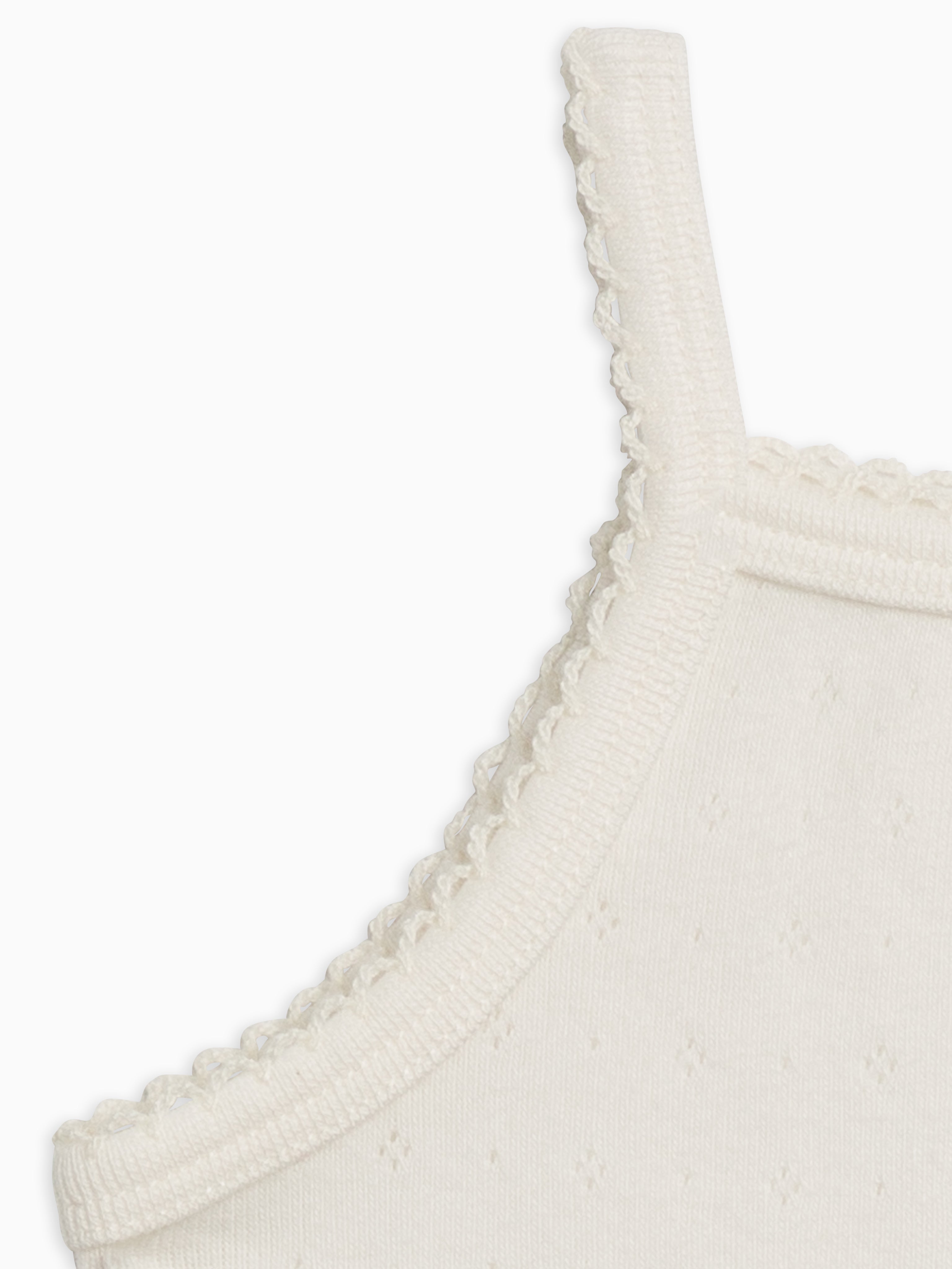White cotton baby camisole with delicate crochet trim for babies and toddlers, an airy layering piece perfect for warm days or under knits.