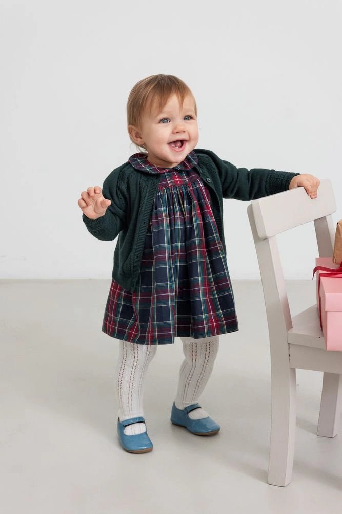 Plaid baby and toddler dress in deep navy with festive red and green checks, perfect for holiday gatherings or elevated everyday holiday occasion wear. The timeless design combines charm and versatility for winter holidays.