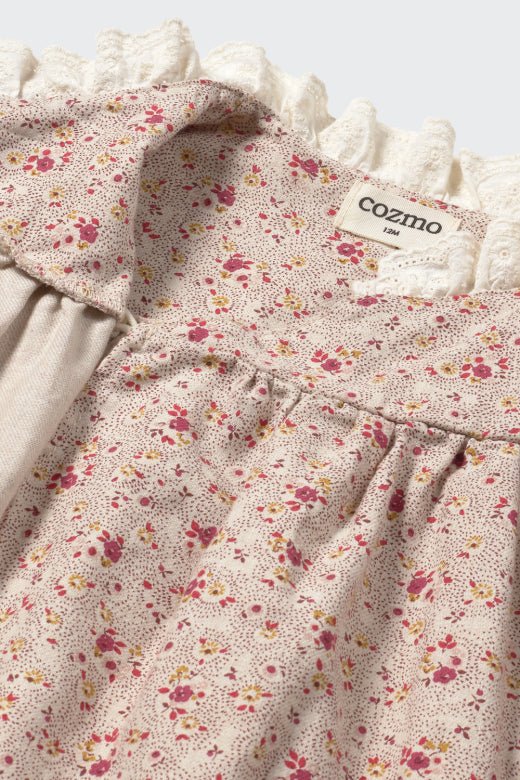 Floral dress for baby girls and toddlers with a ruffle collar and lace detailing, a chic and timeless piece for fall and winter celebrations. Crafted from soft woven cotton, it combines comfort, elegance, and classic charm for every occasion.