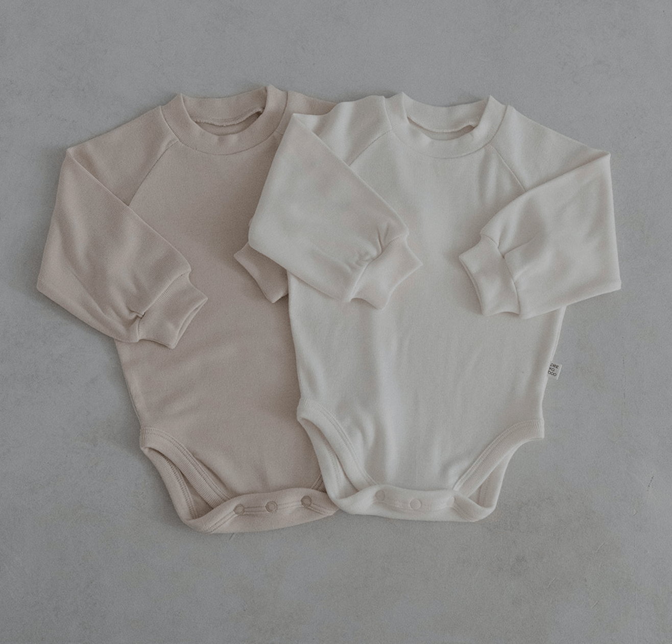 Beige long sleeve baby onesie in a buttery soft knit, an easy over the head essential that makes mixing and matching textures and patterns simple.