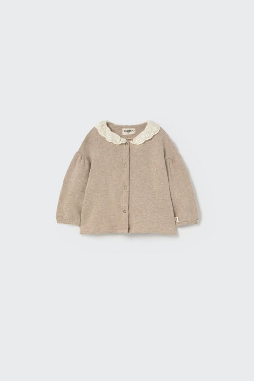 Beige knit snap button down cardigan with lace collar for baby girls and toddlers from MarMar Copenhagen, a leading European baby brand known for timeless quality. Crafted from brushed cotton knit with puffed sleeves and delicate lace trim, it’s a cozy layer that brings charm and comfort to every season.