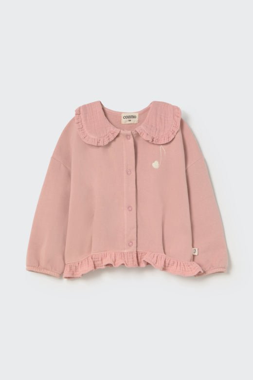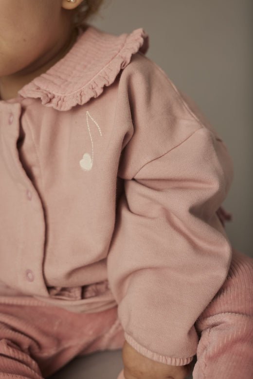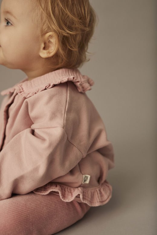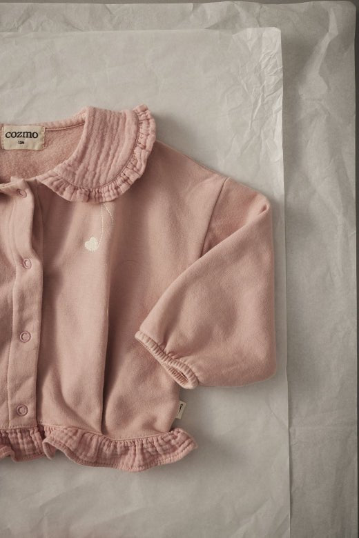 Pink baby cardigan with ruffle collar in soft cotton fleece, perfect for cozy fall and winter outfits for toddlers and little girls. This button down layer blends warmth, comfort, and timeless charm for everyday wear and special moments.