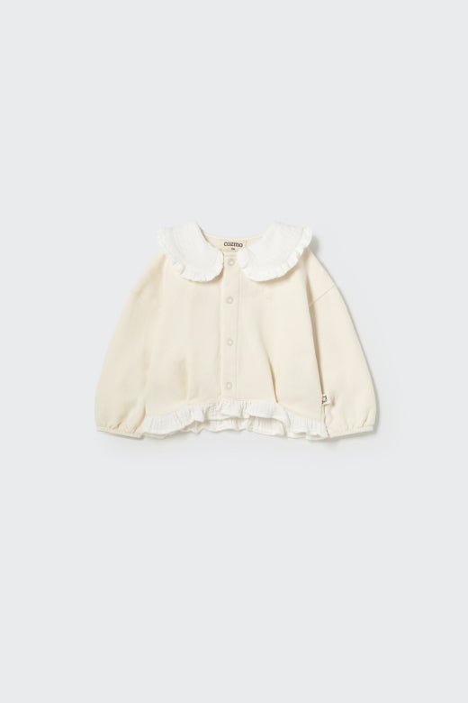 Fleece Cardigan for baby girls in white with with ruffle collar and puffed sleeves in soft cotton, perfect for cozy fall and winter outfits for toddlers and little girls. This button down layer blends warmth, comfort, and timeless charm for everyday wear and special moments.