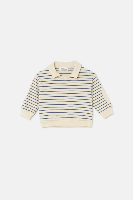 Cream and navy striped collared pullover for baby boys and toddlers, a cozy winter essential that combines timeless design with everyday comfort. Crafted from soft cotton knit, it keeps little ones warm while maintaining a classic, polished look.