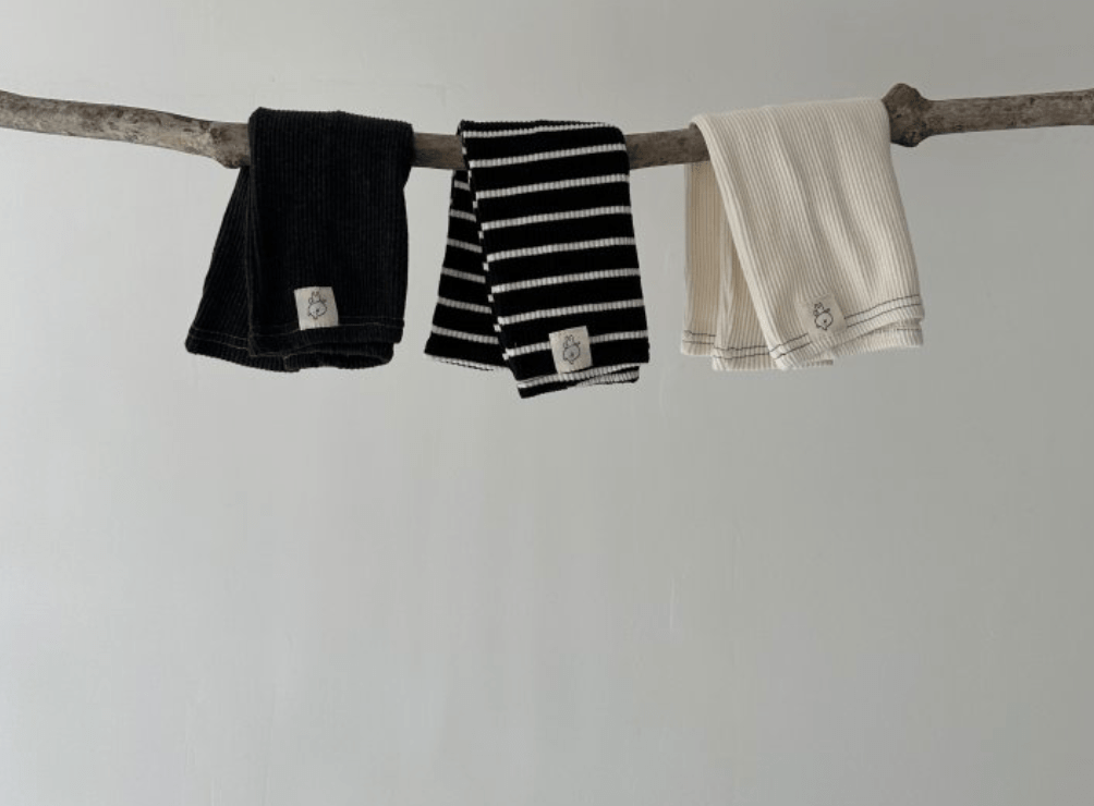Ribbed legging pants in cream with navy blue outline stitching for added texture. These baby jeggings are stretchy and comfy for layering or wearing alone.