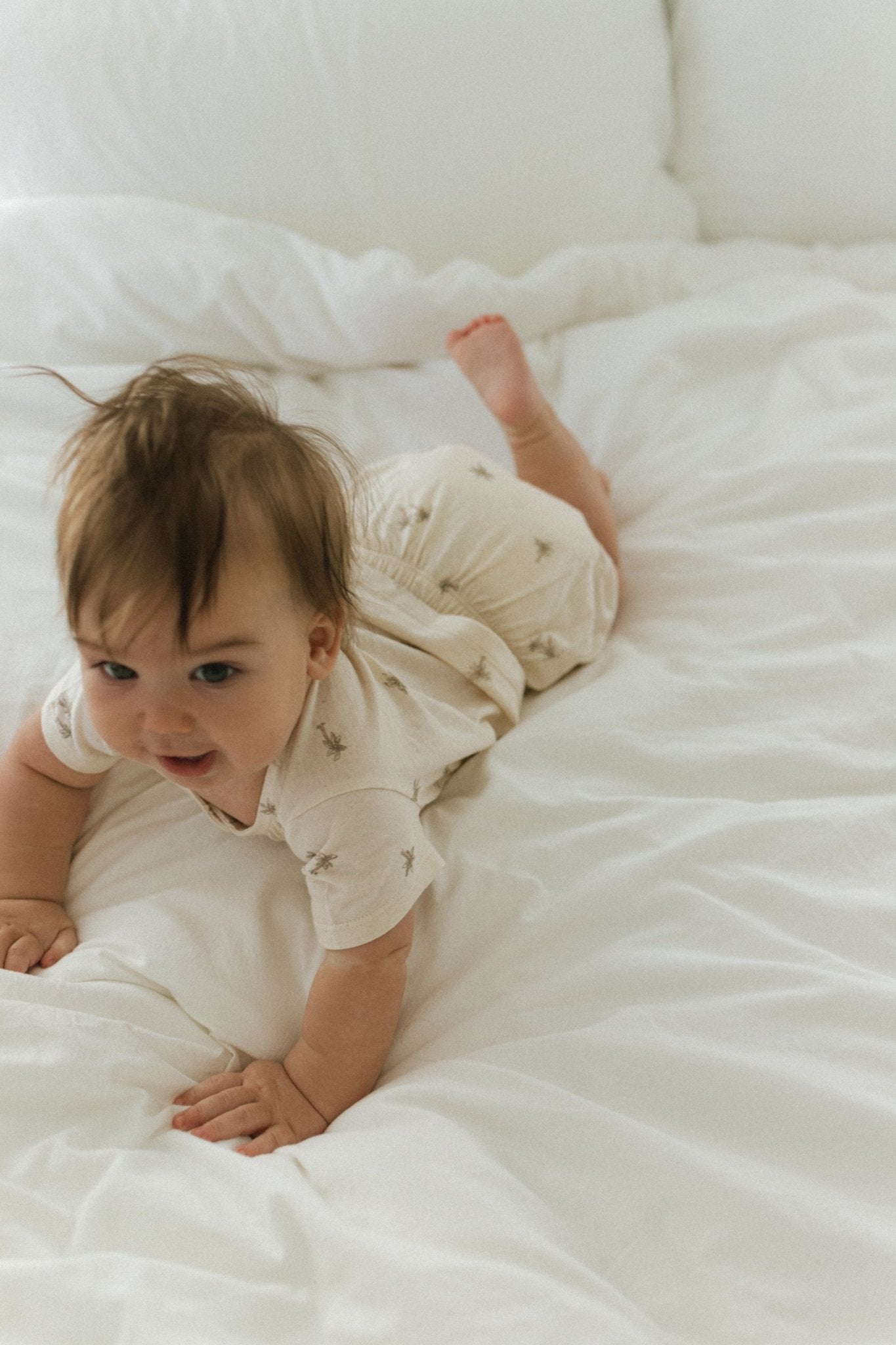 Ivory two piece baby set featuring a palm tree print, a breezy gender neutral outfit perfect for sunny days, vacations, and warm weather adventures.