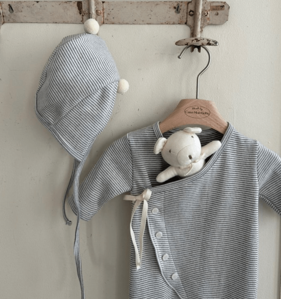 Striped baby footie onesie and matching hat set, a charming two-piece outfit for newborns that adds subtle pattern and movement to a neutral wardrobe. Designed with soft fabrics, traditional button closures, and ribbon details, this set blends comfort, style, and keepsake-quality craftsmanship.