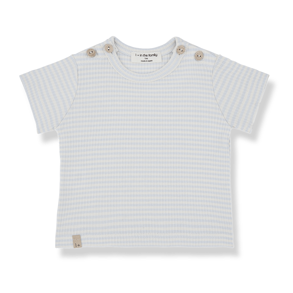 Striped short sleeve baby t-shirt in misty blue from 1+ In The Family, a soft and timeless essential for your little one’s everyday wardrobe. Designed in a light blue ribbed knit with functional wooden shoulder buttons, it combines classic charm with easy comfort.