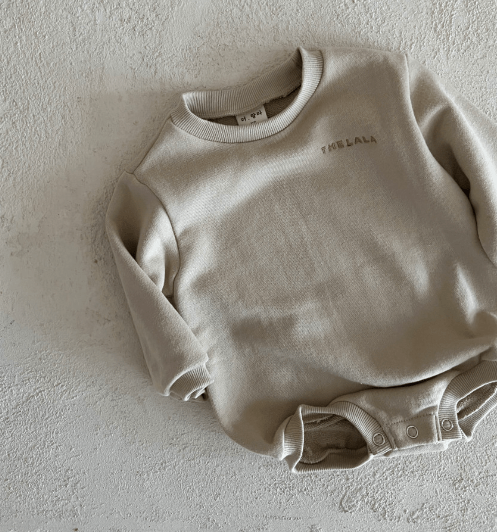 Sweater style onesie in beige with long sleeves, a casual everyday piece that blends cozy comfort with easy wear.