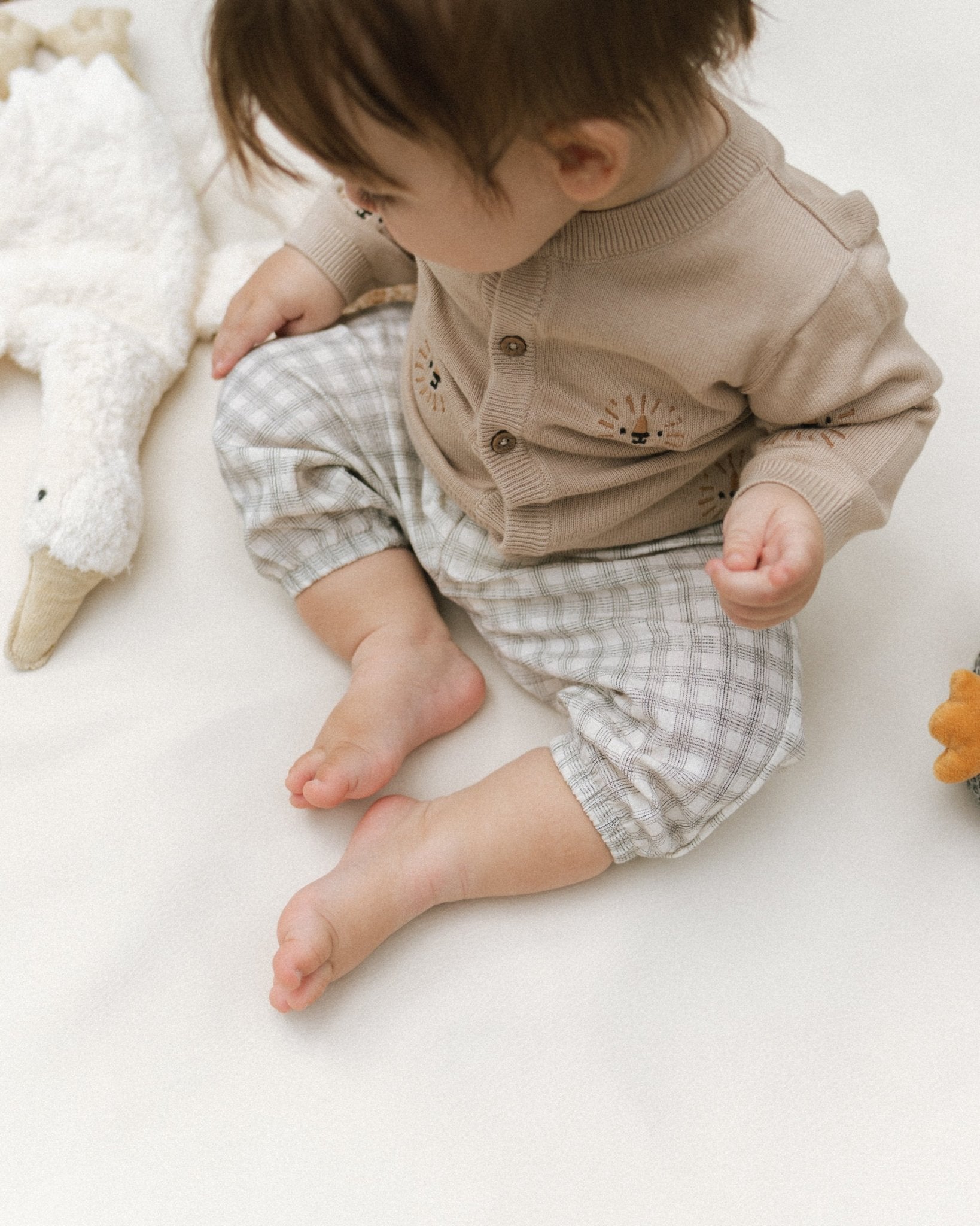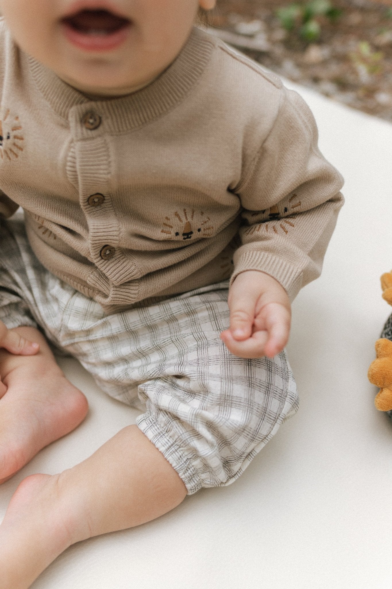 Cozy tan knit cardigan for newborns, babies, and toddlers with charming lion embroidery details — a unisex layering piece that blends warmth, comfort, and playful sophistication.