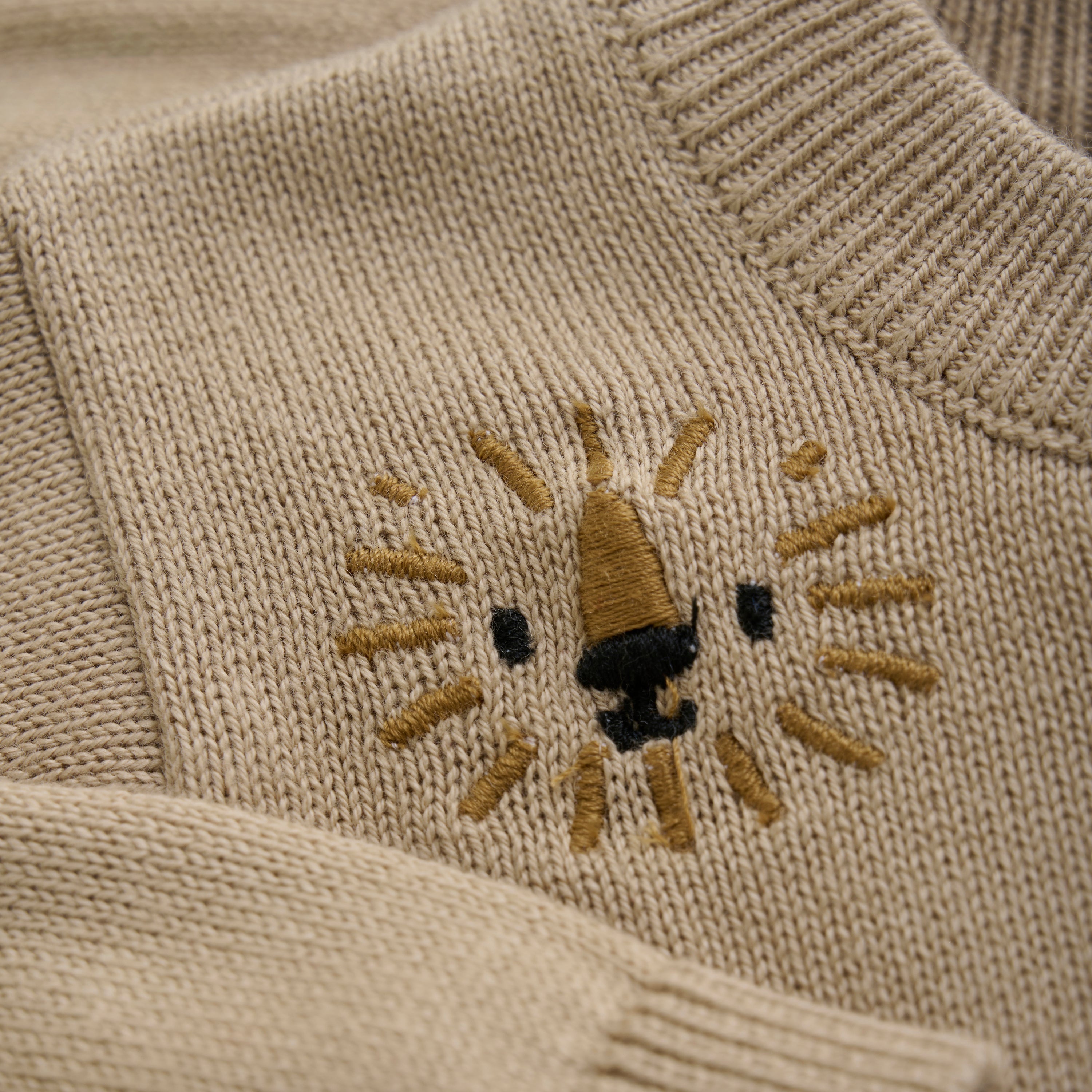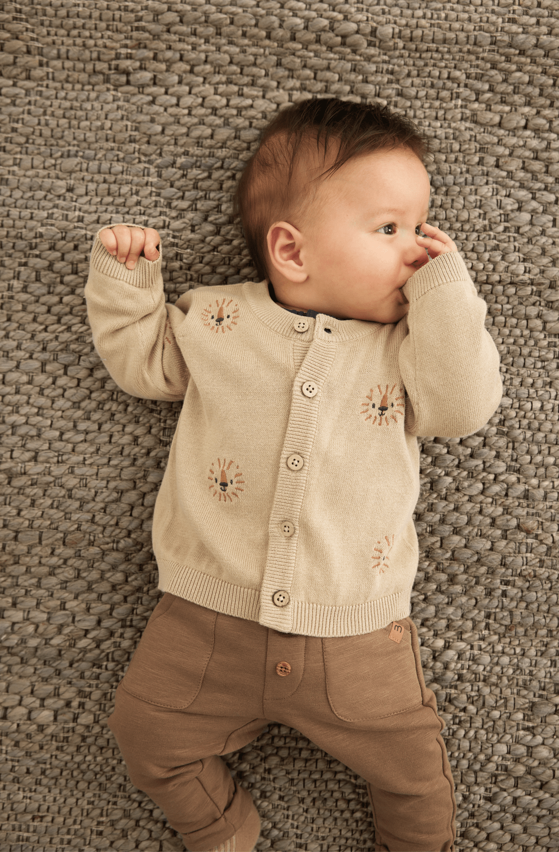 Cozy tan knit cardigan for newborns, babies, and toddlers with charming lion embroidery details — a unisex layering piece that blends warmth, comfort, and playful sophistication.
